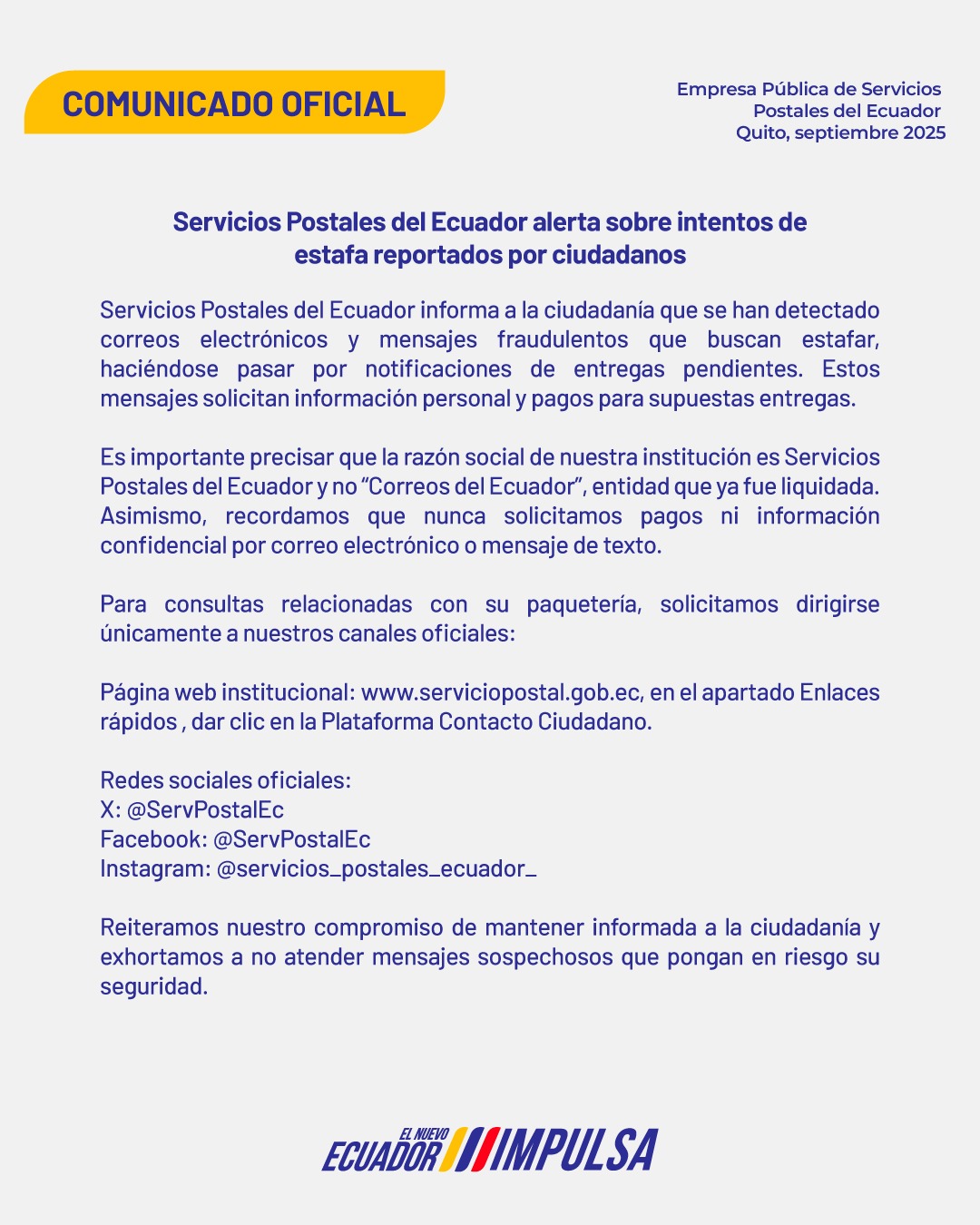 Es importante precisar que la razón social de nuestra institución es Servicios Postales del Ecuador y no “Correos del Ecuador”, entidad que ya fue liquidada. Asimismo, recordamos que nunca solicitamos pagos ni información confidencial por correo electrónico o mensaje de texto.